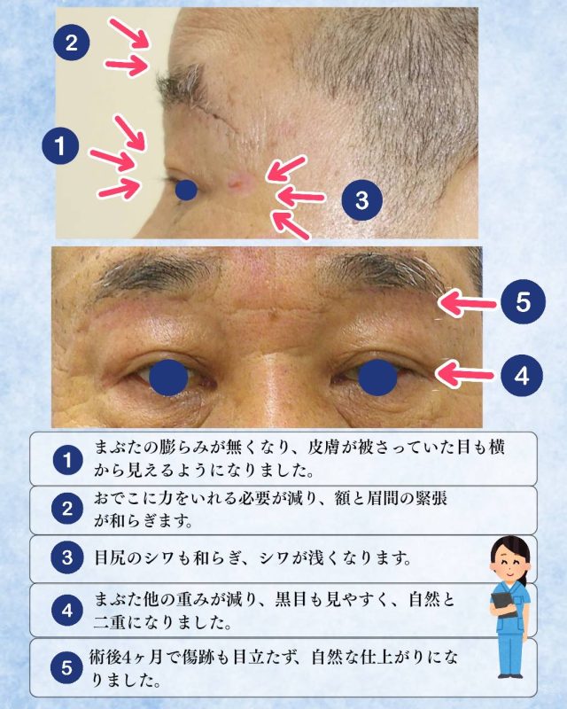 手術によって視界が改善するだけでなく、表情の変化で明るく若々しい印象になったり、目が重くなるなどの疲労感も軽減します。