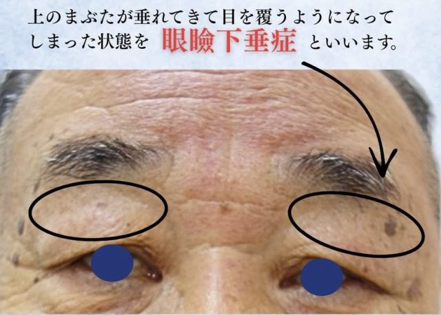 →上まぶたが垂れてきて眼を覆うようになってしまった状態を、眼瞼下垂症といいます。