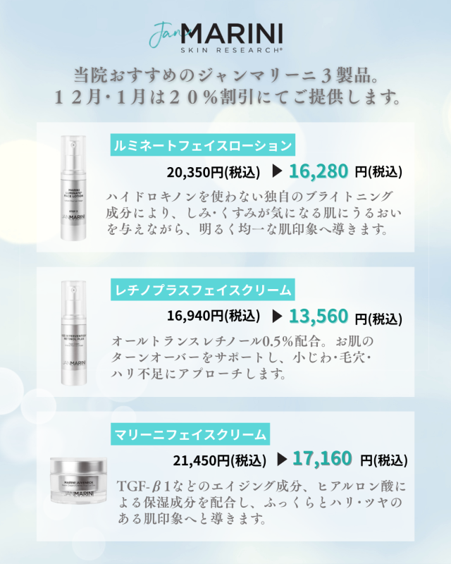 ジャンマリーニスキンリサーチ人気の3製品を、20%offで販売いたします🌟